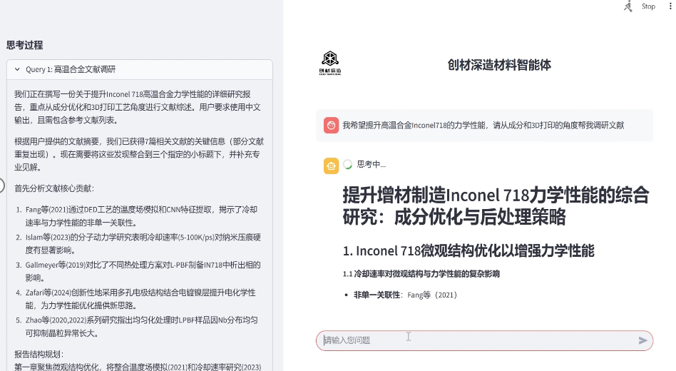 发布会的另一大亮点是Deep Material自主研发的材料智能体(DM Agent)。这一软硬件一体化解决方案具备文献分析、成分优化、工艺优化、实验分析和对比迭代的全流程能力,实现了材料研发的智能化闭环。